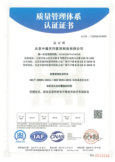 2023年11月20日,北京中健天行醫(yī)藥科技有限公司順利通過ISO9001質量管理體系認證,認證范圍為保健食品、新食品原料研發(fā)申報兩大主營業(yè)務,成為北京地區(qū)率先獲得該認證的研發(fā)申報服務商。