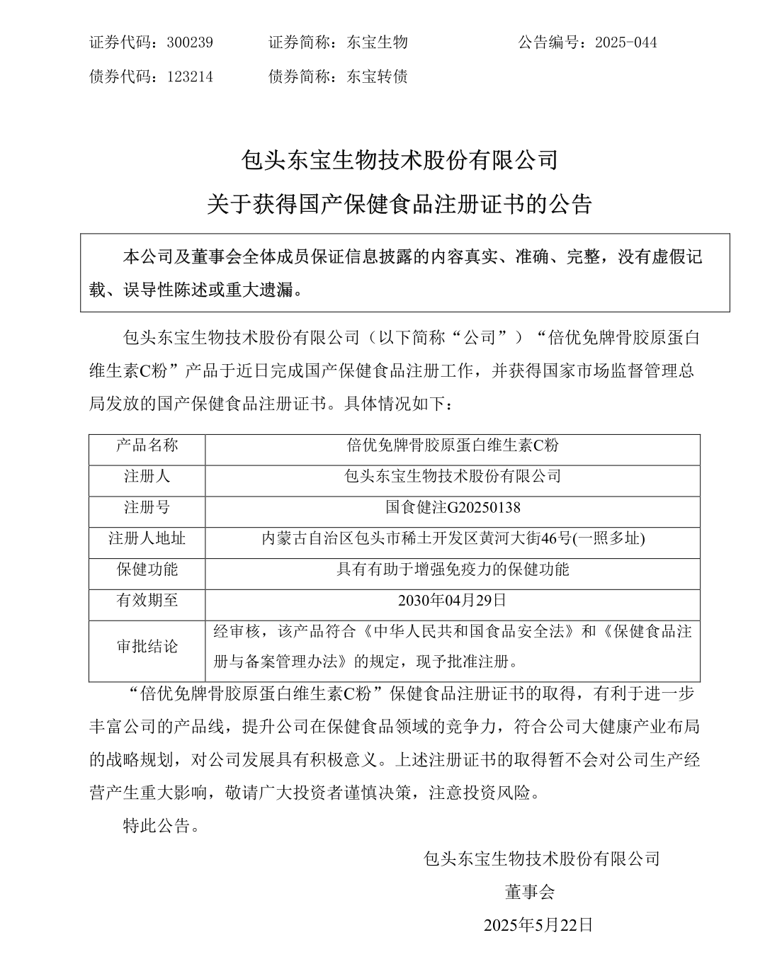 5月22日,東寶生物(證券代碼:300239)發(fā)布公告,近日公司完成了“倍優(yōu)免牌骨膠原蛋白維生素C粉”產(chǎn)品的國(guó)產(chǎn)保健食品注冊(cè)工作,并獲得了國(guó)家市場(chǎng)監(jiān)督管理總局發(fā)放的注冊(cè)證書,注冊(cè)號(hào)為國(guó)食健注G20250138。該產(chǎn)品具有增強(qiáng)免疫力的保健功能,有效期至2030年4月29日。公司表示,此次注冊(cè)證書的取得有利于進(jìn)一步豐富公司的產(chǎn)品線,提升在保健食品領(lǐng)域的競(jìng)爭(zhēng)力,符合公司在大健康產(chǎn)業(yè)布局的戰(zhàn)略規(guī)劃,對(duì)公司發(fā)展具有積極意義。