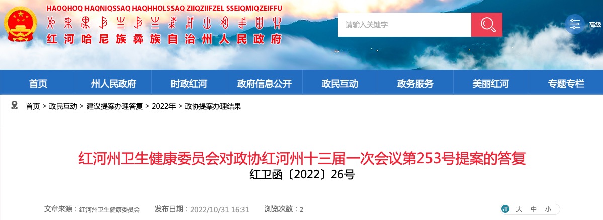 紅河州衛(wèi)生健康委員會對政協(xié)紅河州十三屆一次會議第253號提案的答復