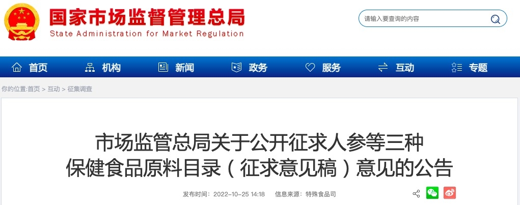 為進(jìn)一步推進(jìn)保健食品備案工作,根據(jù)《中華人民共和國食品安全法》,市場(chǎng)監(jiān)管總局組織制修訂了人參等三種保健食品原料目錄(征求意見稿),現(xiàn)面向社會(huì)公開征求意見,意見建議反饋截止時(shí)間為2022年11月25日。公眾可以通過以下途徑和方式提出意見建議: