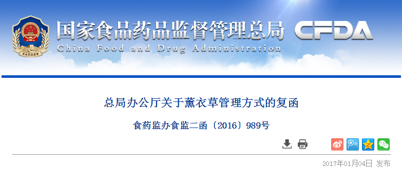 你局《關(guān)于明確薰衣草管理方式的請示》(冀食藥監(jiān)〔2016〕51號)收悉。經(jīng)商農(nóng)業(yè)部和衛(wèi)生計生委,現(xiàn)函復如下: