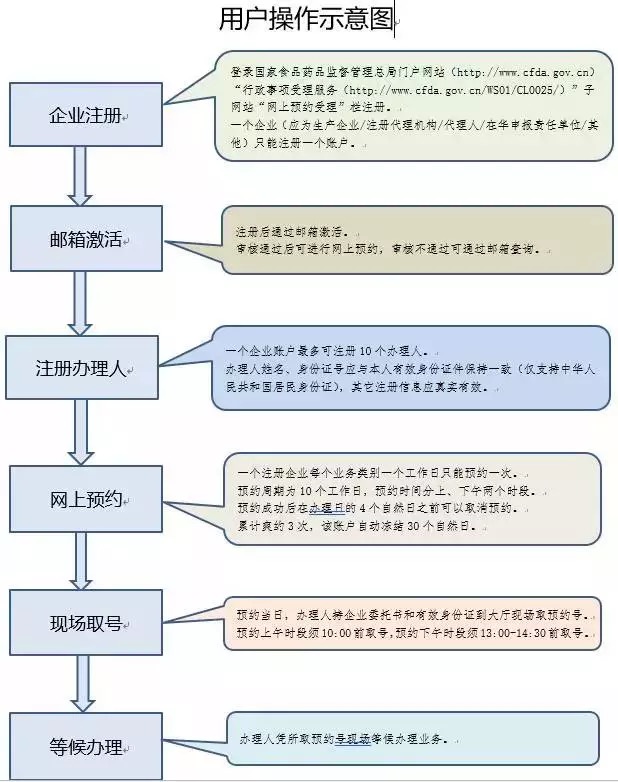 三、注冊(cè)方式。2017年7月20日起,申請(qǐng)人可登陸國家食品藥品監(jiān)督管理總局門戶網(wǎng)站“行政事項(xiàng)受理服務(wù)”子網(wǎng)站(http://www.cfda.gov.cn/WS01/CL0025/ )提前注冊(cè)(詳見用戶操作示意圖)。注冊(cè)審核通過后,企業(yè)方可辦理網(wǎng)上預(yù)約業(yè)務(wù)。