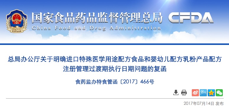 你局《關(guān)于特殊醫(yī)學(xué)用途配方食品注冊(cè)和嬰幼兒配方乳粉產(chǎn)品配方注冊(cè)要求中進(jìn)口產(chǎn)品執(zhí)行日期問題的請(qǐng)示》(滬食藥監(jiān)食生函〔2017〕131號(hào))收悉。經(jīng)研究,現(xiàn)函復(fù)如下: