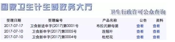 2017年07月20日,國家衛(wèi)計(jì)委新食品原料受理系統(tǒng)又有最新動(dòng)態(tài)。此次受理的新食品原料為枇杷花、連翹葉、布拉氏酵母菌,受理編號(hào)依次為:衛(wèi)食新申字(2017)第0004號(hào)、衛(wèi)食新申字(2017)第0005號(hào)、衛(wèi)食新進(jìn)申字(2017)第0001號(hào),擬公告內(nèi)容: