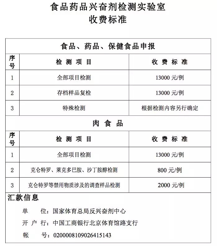 請按照《食品藥品興奮劑檢測實驗室收費標準》(見附件四)匯款,以單位名義匯款應提供納稅人識別碼;若以個人名義匯款,應在附言中注明發(fā)票抬頭及納稅人識別碼。