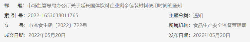 《市場(chǎng)監(jiān)管總局關(guān)于加強(qiáng)固體飲料質(zhì)量安全監(jiān)管的公告》(2021年第46號(hào))(以下簡(jiǎn)稱《公告》)發(fā)布以來(lái),有關(guān)食品行業(yè)協(xié)會(huì)、固體飲料生產(chǎn)企業(yè)和地方市場(chǎng)監(jiān)管部門(mén)陸續(xù)反映,受新冠肺炎疫情影響,部分固體飲料生產(chǎn)企業(yè)現(xiàn)有產(chǎn)品包裝材料有一定數(shù)量的剩余。為嚴(yán)格執(zhí)行《公告》,減少浪費(fèi),幫助企業(yè)紓困解難,經(jīng)研究決定,固體飲料生產(chǎn)企業(yè)現(xiàn)有產(chǎn)品包裝材料在2022年6月1日前未使用完畢的,可以延期使用至2022年12月31日。