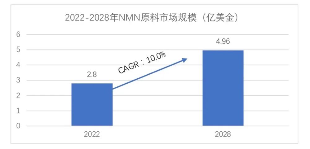美國的市場研究公司(GlobeNewswire)的數(shù)據(jù)顯示,2022年全球NMN的原料市場銷售額預(yù)估為2.8億美金,其預(yù)測到2028年,NMN的原料銷售額將達(dá)到4.96億美金,年復(fù)合增長率達(dá)到10.0%[1]。主要的供應(yīng)商包括基因港(GeneHarbor)、霍伯麥(Herbalmax)、日本新和制藥(Shinkowa)和音芙醫(yī)藥(EffePharm)。四家的原料合計(jì)占比達(dá)到了83%的市場占有率。