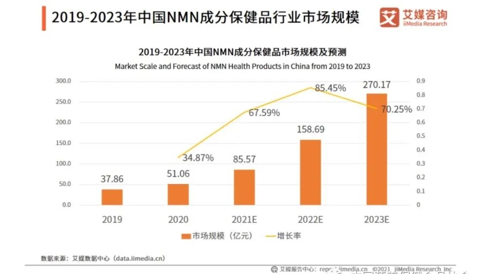中國作為NMN的最大消費(fèi)市場,依據(jù)艾媒數(shù)據(jù)中心數(shù)據(jù),2020年含NMN成分食品的市場規(guī)模達(dá)51.06億元,同比增長34.87%,預(yù)計(jì)到2023年將會(huì)以近70.25%的增速攀升至270.13億元,行業(yè)發(fā)展速度較快[2]。市場規(guī)模和增長率如下圖所示。