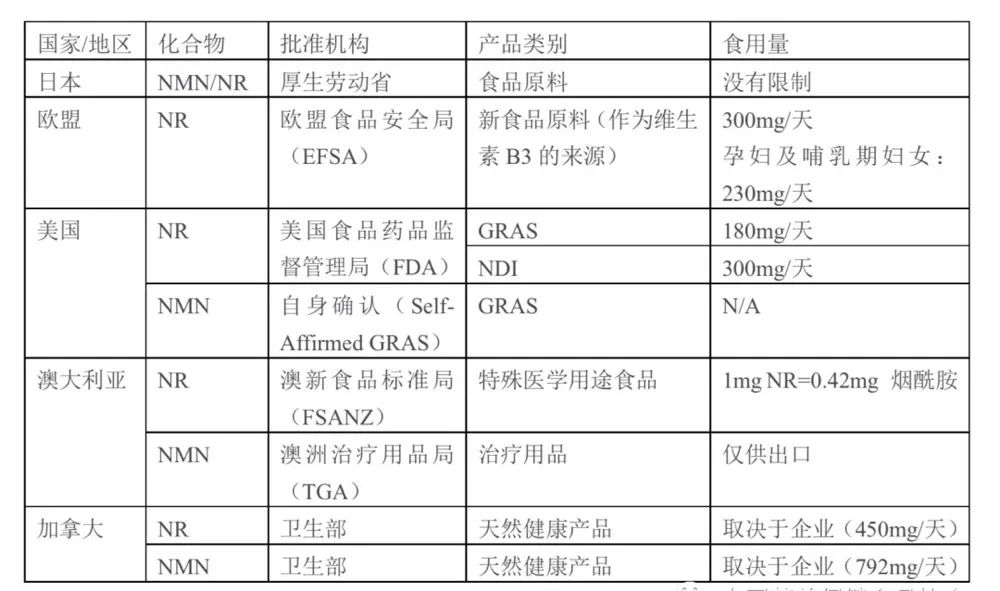 從中可以看出,NR在歐盟、美國、日本都基本批準(zhǔn)作為食品原料,其相當(dāng)于維生素B3(煙酸)的一個(gè)來源。NMN在日本、美國作為食品原料進(jìn)行管理。NMN/NR在加拿大都是作為天然健康產(chǎn)品進(jìn)行管理。
