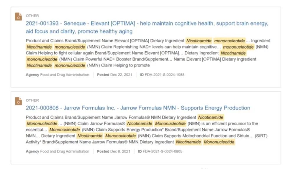 我們也看到了美國上市的NMN產(chǎn)品有很多,這可以從美國FDA關(guān)于結(jié)構(gòu)/功能聲稱的申請(qǐng)文件中看出,如下圖所示[7]。