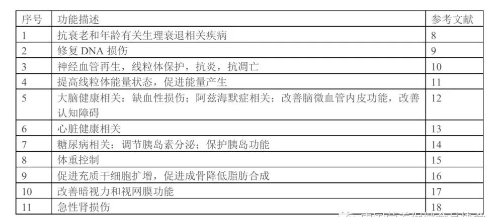 近幾年,有關(guān)NMN生物學(xué)功能的研究日益增加[8,9-18],如:改善與年齡有關(guān)的病理生理和疾病狀況,明顯減輕與年齡相關(guān)的生理衰退,改善細(xì)胞能量狀態(tài)、神經(jīng)系統(tǒng)、大腦認(rèn)知(阿茲海默)等,并對(duì)心臟病、糖尿病等諸多疾病情況的改善顯示出良好效果。整理如下表所示。
