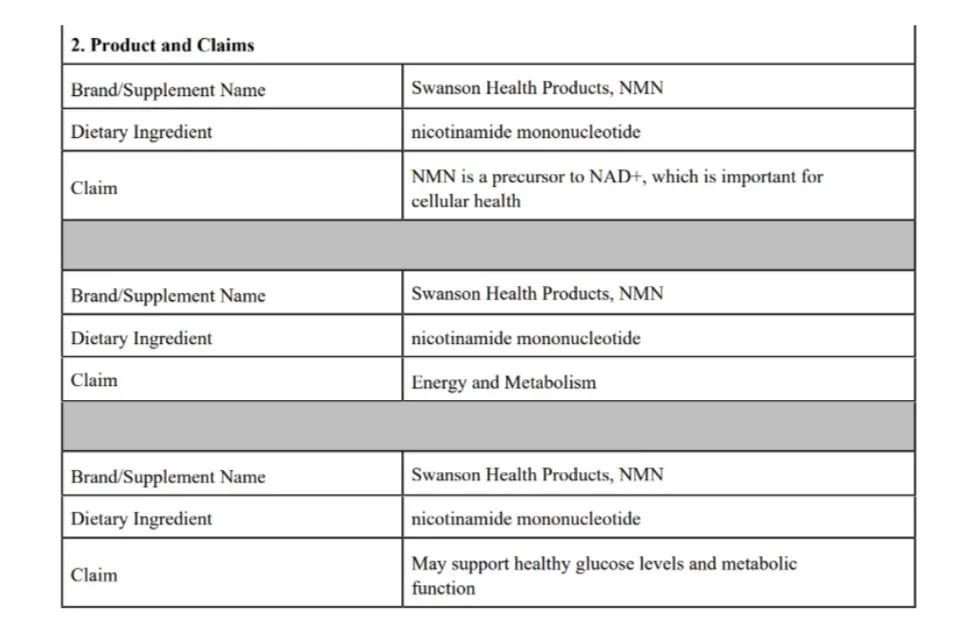 我們下載了一個(gè)美國FDA中Swanson Health Products, NMN的結(jié)構(gòu)/功能申請(qǐng)[19],截圖如下: