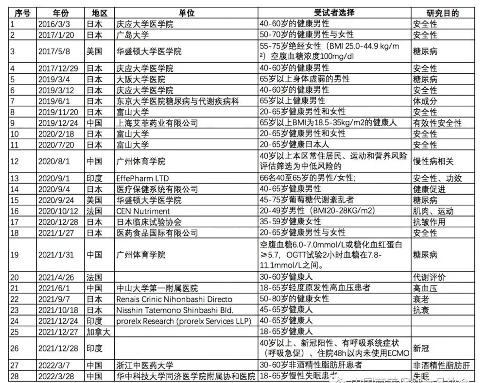 如上面提到,安全性作為食品的重要指標(biāo),NR在全球主要國家及地區(qū)已經(jīng)批準(zhǔn)作為食品原料,其安全性已經(jīng)得到了相關(guān)的證明。NMN作為一個(gè)新的原料,目前已經(jīng)被日本批準(zhǔn)作為食品原料,在其他主要國家和地區(qū)可以作為膳食補(bǔ)充劑原料,說明其安全性已經(jīng)得到了一定的驗(yàn)證。但是對(duì)于人體的安全性數(shù)據(jù)還是比較少的,目前全球范圍內(nèi)對(duì)于NMN的臨床實(shí)驗(yàn)很多涉及到安全性評(píng)估和其他相關(guān)功能評(píng)估。我們整理了目前全球范圍內(nèi)涉及到NMN的臨床研究,結(jié)果如下表所示。