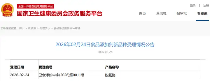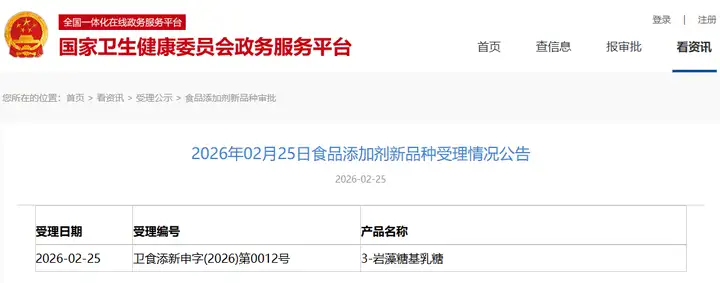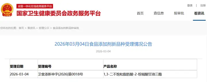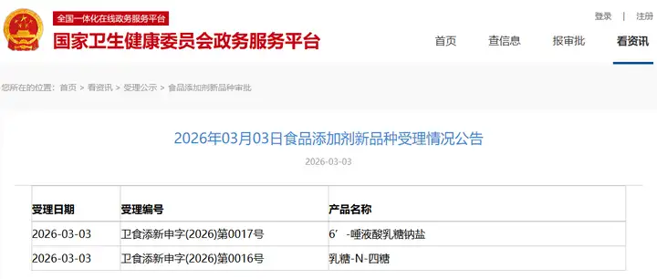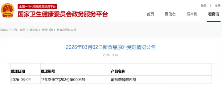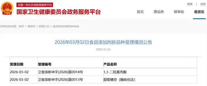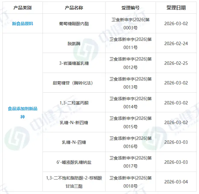新增受理1種新食品原料