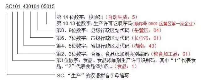 一、食品生產(chǎn)許可證編號(hào)由SC(“生產(chǎn)”的漢語(yǔ)拼音字母縮寫(xiě))和14位阿拉伯?dāng)?shù)字組成。數(shù)字從左至右依次為:3位食品類別編碼、2位省(自治區(qū)、直轄市)代碼、2位市(地)代碼、2位縣(區(qū))代碼、4位順序碼、1位校驗(yàn)碼。