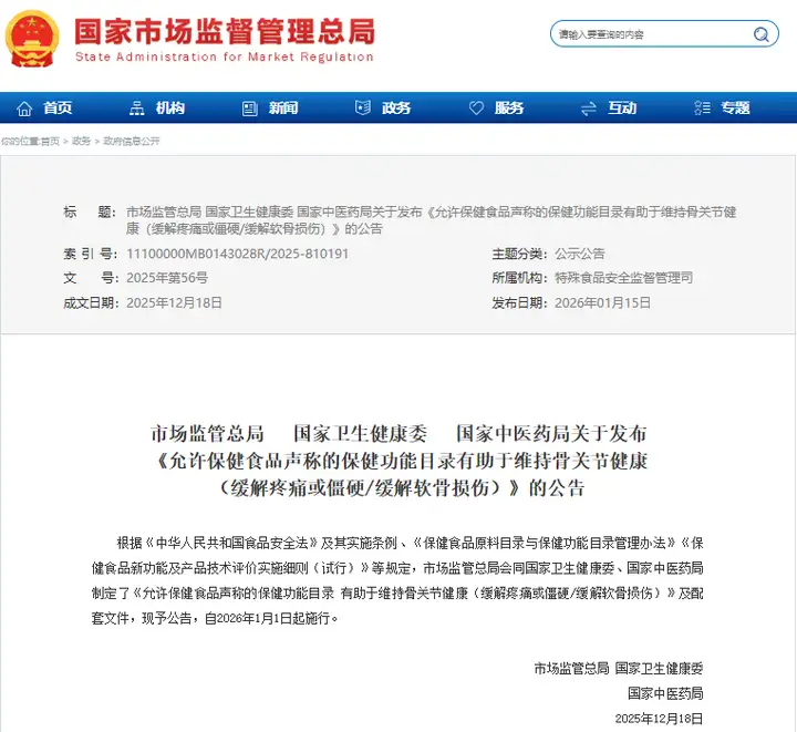 近日,市場(chǎng)監(jiān)管總局發(fā)布《允許保健食品聲稱的保健功能目錄 有助于維持骨關(guān)節(jié)健康(緩解疼痛或僵硬/緩解軟骨損傷)》。這是《保健食品原料目錄與保健功能目錄管理辦法》和《保健食品新功能及產(chǎn)品技術(shù)評(píng)價(jià)實(shí)施細(xì)則(試行)》發(fā)布后,第一個(gè)納入保健功能目錄的保健食品新功能,標(biāo)志著我國保健食品新的功能聲稱及相應(yīng)產(chǎn)品市場(chǎng)準(zhǔn)入邁出新步伐,市場(chǎng)監(jiān)管總局深化保健食品注冊(cè)備案制度改革取得新成效。