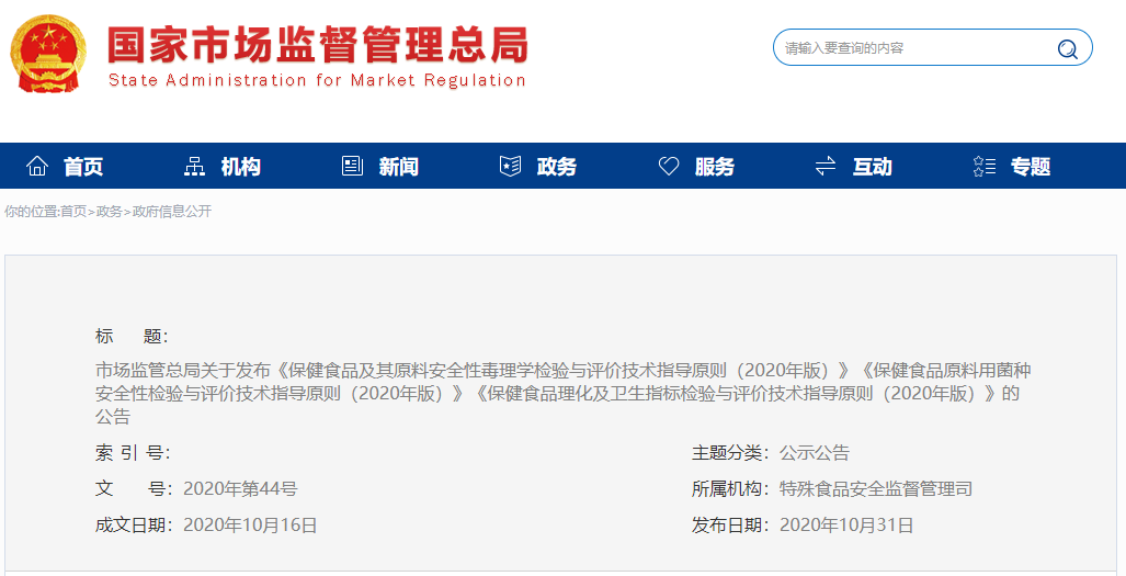 根據(jù)《中華人民共和國食品安全法》,經(jīng)與國家衛(wèi)生健康委協(xié)商一致,市場監(jiān)管總局制定了《保健食品及其原料安全性毒理學(xué)檢驗與評價技術(shù)指導(dǎo)原則(2020年版)》《保健食品原料用菌種安全性檢驗與評價技術(shù)指導(dǎo)原則(2020年版)》《保健食品理化及衛(wèi)生指標檢驗與評價技術(shù)指導(dǎo)原則(2020年版)》,現(xiàn)予印發(fā),自公告之日起施行。