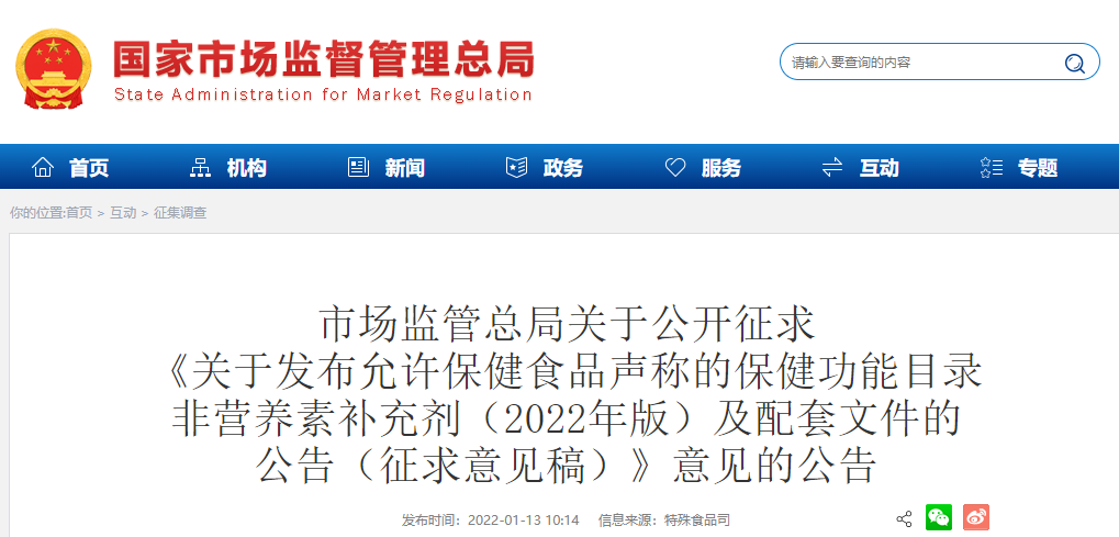 為進(jìn)一步推進(jìn)保健食品注冊(cè)工作,根據(jù)《中華人民共和國(guó)食品安全法》《保健食品注冊(cè)與備案管理辦法》《保健食品原料目錄和功能目錄管理辦法》,市場(chǎng)監(jiān)管總局組織制定了《關(guān)于發(fā)布〈允許保健食品聲稱的保健功能目錄 非營(yíng)養(yǎng)素補(bǔ)充劑(2022年版)〉及配套文件的公告(征求意見稿)》,現(xiàn)面向社會(huì)公開征求意見,意見建議反饋截止時(shí)間為2022年2月12日。公眾可以通過以下途徑和方式提出意見建議: