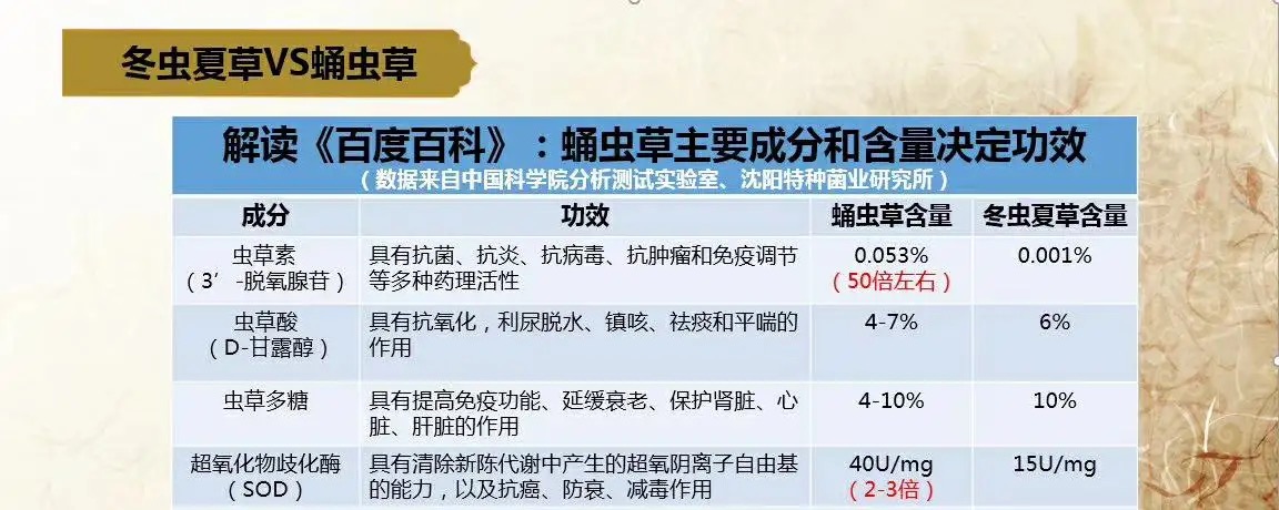而人們目前所說的蛹蟲草多指以蠶蛹為寄主,人工栽培的,用蛹蟲才菌感染的有蟲又有草的復(fù)合體。這種蛹蟲草和冬蟲夏草同屬于蟲草屬,與冬蟲夏草不同的是蛹蟲草可以人工培育,具有相似的營養(yǎng)成分和功效成分。