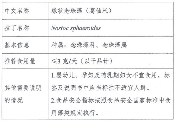2018年9月12日國(guó)家衛(wèi)生健康委員會(huì)發(fā)布“關(guān)于黑果腺肋花楸果等2種新食品原料的公告 (2018年 第10號(hào))”正式批準(zhǔn)球狀念珠藻(葛仙米)為新食品原料。