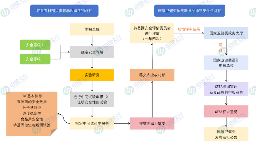 新食品原料申報(bào)部分按照《食品安全法》、《新食品原料安全性審查管理辦法》、《新資源食品原料申報(bào)與受理規(guī)定》等;目前農(nóng)業(yè)農(nóng)村部沒(méi)有發(fā)布食品用轉(zhuǎn)基因微生物安全性評(píng)估指南,轉(zhuǎn)基因微生物安全評(píng)估申報(bào)部分主要參考《動(dòng)物用轉(zhuǎn)基因微生物安全評(píng)價(jià)指南》中有關(guān)“中間試驗(yàn)”申報(bào)書(shū)的要求,組織撰寫(xiě)完整內(nèi)容的申報(bào)書(shū)。申請(qǐng)人按照上述規(guī)定準(zhǔn)備申報(bào)材料,向國(guó)家衛(wèi)生健康委員會(huì)提出受理申請(qǐng),首先由農(nóng)業(yè)農(nóng)村部評(píng)價(jià)轉(zhuǎn)基因菌種的安全性,然后由國(guó)家衛(wèi)生健康委員會(huì)評(píng)價(jià)新食品原料的安全性。具體申報(bào)流程如下: