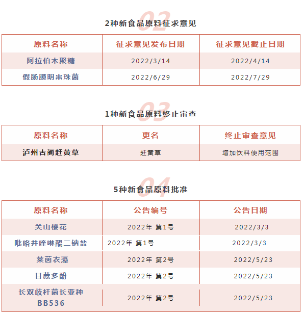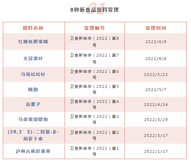 2022年1-7月,國家衛(wèi)生健康委員會共受理瀘州古藺趕黃草、馬尾松松針、桃膠、紅糖低聚果糖等8種新食品原料;對假腸膜明串珠菌、 阿拉伯木聚糖2種新食品原料進行意見征求;批準5種新食品原料,分別是關山櫻花、吡咯并喹啉醌二鈉鹽、萊茵衣藻、長雙歧桿菌長亞種BB536、甘蔗多酚;不予行政許可的新食品原料有3種,分別是牛樟芝菌絲體粉、異麥芽糊精、玉米發(fā)酵物。